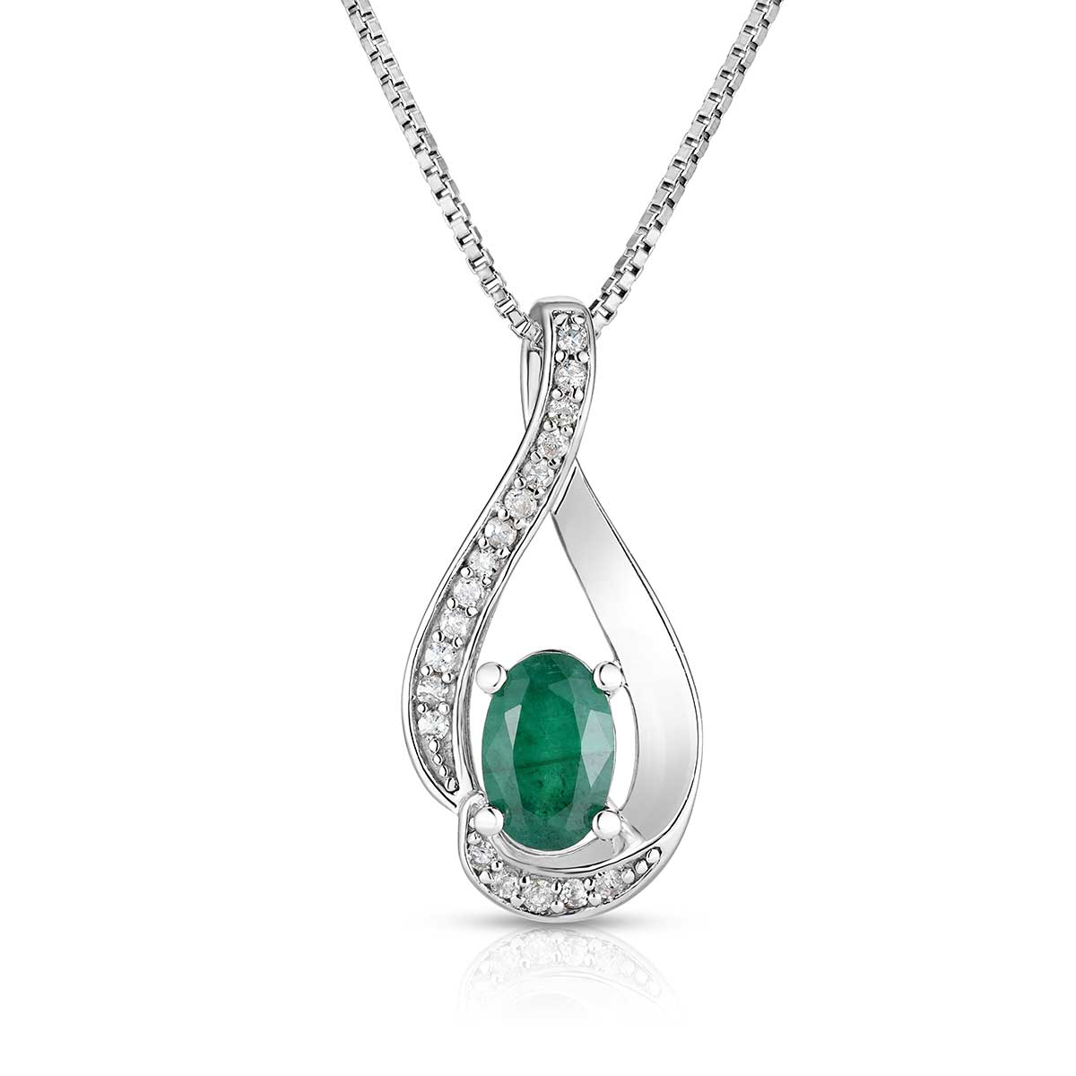 Sterling Silver Emerald 6x4mm & .08ctw Diamond Swirl Pendant With Box Chain